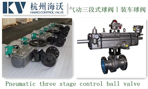 气动三位式装车球阀是一种能实现两步开或两步关动作的切断阀,可以在打开或关闭过程中停顿一次,根据系统要求精确控制流量,尤其适用于化工或油品装车系统中,使开阀、关阀速度减缓,管道流体变化平稳,不会因冲击产生水锤现象是易燃流体发生爆炸;例如阀门一次全部打开,开始装车,当流量接近设定值时,阀门关闭到小流量状态,当达到设定值时阀门全部关闭。小流量可以在0~45%之间现场设定,比如5%,8%,10%,15%等,最终达到精确控制。