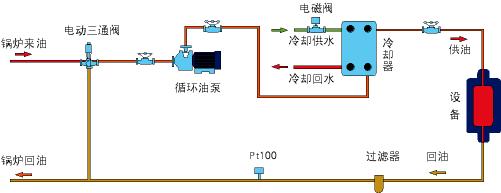 (电动三通调节阀控制用户导热油加热,电磁阀控制水冷却)