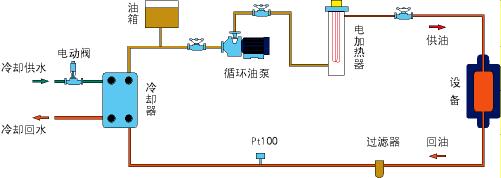 导热油温控装置是由循环油泵、电加热器、冷却器、冷却阀(或风机)、温度传感器、油箱、阀组及控制柜构成。温控装置特别适合于高温冷却需求(冰点以下),该装置经常是以加热为主,冷却为辅。