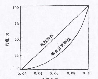 (2)信号、转角与行程的关系:等百分比特性与线性特性之间信号、转角与行程的关系是不同的,在现场使用时按表2和图1进行调校。