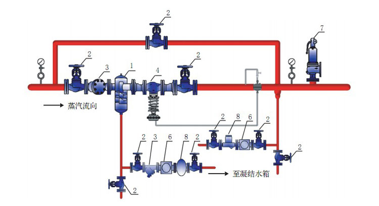 建议在减压站出口处安装管道疏水阀组,当停机时能迅速排出冷凝水防止形成管道水锤。