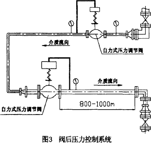 控制系统为稳定阀后压力的系统,介质为氮气,系统的初始管道压力为2800KPa,后工段所需要的最大流量为2000NM3/h。工艺要求是后工段使用介质10分钟后停止使用1小时,并按此方式循环使用;正常使用时阀后压力稳定在700KPa,停止使用时阀后压力不得高于800KPa。阀后输送管道长度为800∼1000米左右(如图3所示)。