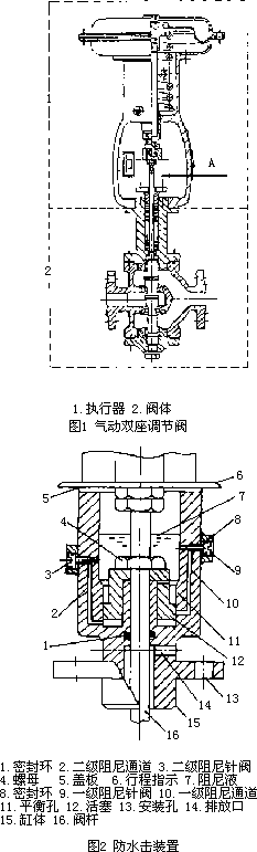 将防水击装置安装到DN100mm气动薄膜调节阀上作了对比试验。试验结果表明,加装分程缓开闭装置的效果十分明显。在系统压力为0.5MPa时,不使用分程缓闭装置的调节阀,突然关阀时产生的水击压力峰值约为3.2MPa。使用了分程缓闭装置的调节阀,在同样条件的水击压力峰值为1.2MPa。在调节阀最后的5%关闭行程内,动态响应速度有所下降,但不影响工业生产的正常使用要求。