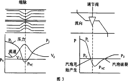 需要说明,这里所讲的空化(caviation)或空蚀,即通常所说的气蚀。那为什么不用气蚀这个词呢?如前所述,空化是一个过程,空化不一定,也不仅仅产生空蚀,只有当高压液体流经阀的节流口后,其出口压力P2等于或高于该液体的汽化压力Pv时,汽泡破裂所释放的巨大空化能才对节流组件产生破坏,即空蚀。如果出口P2低于汽化压力Pv流出,节流降压过程所产生的汽泡就不会破裂,而是夹在液体中成为“二相流”,通常称为“闪蒸”流动。闪蒸流动一般不会对节流元件产生破坏,但会产生阻塞流,而使调节阀流量减少,与此同时,还会产生强烈的噪声和振动,该噪声称为空化噪声。由此可知,空蚀或气蚀仅仅是空化过程的结果之一。因此,我们所讲的防空化要领即基于此。防空化,即是防止其流体在节流降压过程中产生汽泡,当然也就不会有气蚀,更不会产生闪蒸流动.这和防气蚀是不同的,防气蚀是指汽泡产生了,但不让其对节流元件产生空蚀。如前所述,由于空化能很高,只有在压差较低的情况下选用适当材料才能延缓其空蚀,但不能有效抵抗空蚀。因此,防空化是治本、治源,是积极的办法,而防气蚀则是治标而且往往难以实现。
