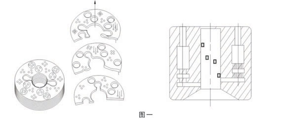 电动(气动)防空化高压差调节阀的关键技术是节流组件。本产品采用的轴向多级分流叠板集成块或节流组件、即是根据多级降压防空化原理,将阀的全开度范围分为若干组相互独立的空间,在其每个独立空间都有高有径向流道、轴向节流孔和缓冲室,并按一定规律分布于若干块圆环板上,经机加工成型后叠装在一起,采用特种工艺技术将其集成一个不可分割的整体--集成块式结构(图一)。达到密封绝对可靠。阀工作时,各开度的高压流体进入节流组件后,分别在各自的独立空间内进行多级节流、缓冲膨胀和转变折流,它们之间各行其道,互不干扰。因此,各开度的高压流体,从节流组体入口到出口,其压力和差均按一定规律逐步降低,从而达到有效防止空化与空蚀。