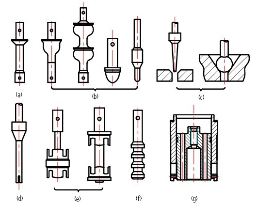 a)平板型阀芯、b)柱塞型阀芯 、c)球型、针型阀芯 、 d)圆柱体上铣出小槽阀芯 、e)窗口型阀芯、f)多级阀芯、g)套筒阀阀芯